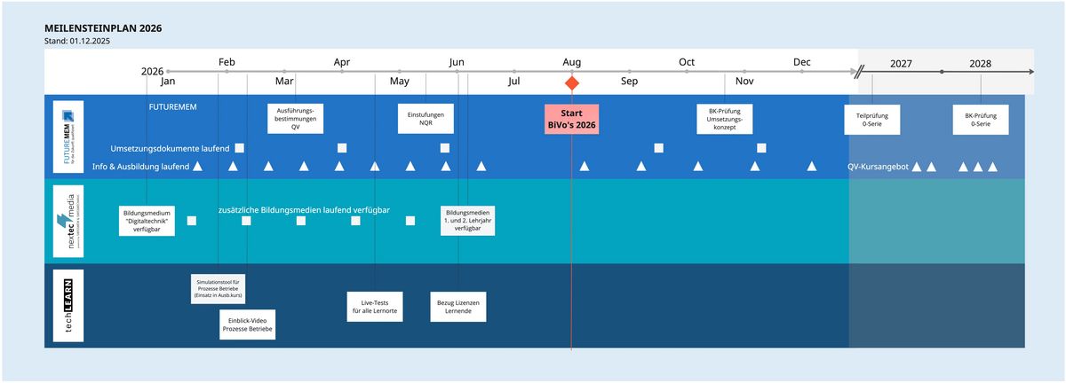 Unter dem Namen techLEARN entsteht eine neue digitale Lernumgebung für die Ausbildung in den acht FUTUREMEM-Berufen. In Kombination mit den Bildungsmedien von nextecmedia bietet sie ab Sommer 2026 eine starke digitale Basis für die Berufliche Grundbildung. techLEARN kommt bei den FUTUREMEM-Kursen für Betriebe zur Anwendung und vermittelt über den kostenlosen Lernpfad «Grundlagen FUTUREMEM» das nötige Grundwissen für die Umsetzung von FUTUREMEM. Ab dem 23. Januar ermöglicht das Simulationstool von techLEARN Einblicke in die Funktionsweise der neuen Lernumgebung. Ab dem 20. April 2026 startet das Testing des Live-Systems mit ausgewählten Betrieben und Partnern. Über infonoSpam@techlearn.swiss erhalten Interessierte weitere Informationen. techLEARN-Lizenzen für die Ausbildung ab Lehrbeginn 2026 können ab dem 1. Juni 2026 erworben werden.
