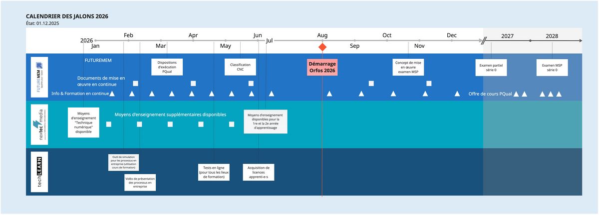 Un nouvel environnement d’apprentissage numérique pour la formation dans les huit métiers FUTUREMEM est en cours de création sous le nom de techLEARN. En combinaison avec les supports pédagogiques de nextecmedia, il offrira à partir de l’été 2026 une base numérique solide pour la formation professionnelle initiale. techLEARN est utilisé dans les cours FUTUREMEM destinés aux entreprises et transmet, par le biais du parcours de formation « Bases FUTUREMEM », les connaissances de base nécessaires à la mise en œuvre de FUTUREMEM. À partir du 23 janvier, l’outil de simulation de techLEARN permettra de se faire une idée du fonctionnement du nouvel environnement d’apprentissage. Le système live sera testé avec une sélection d’entreprises et de partenaires à partir du 20 avril 2026. Les personnes intéressées peuvent obtenir de plus amples informations par mail à infonoSpam@techlearn.swiss. Les licences techLEARN pour la formation à partir du début de l’apprentissage 2026 pourront être acquises à partir du 1er juin 2026.